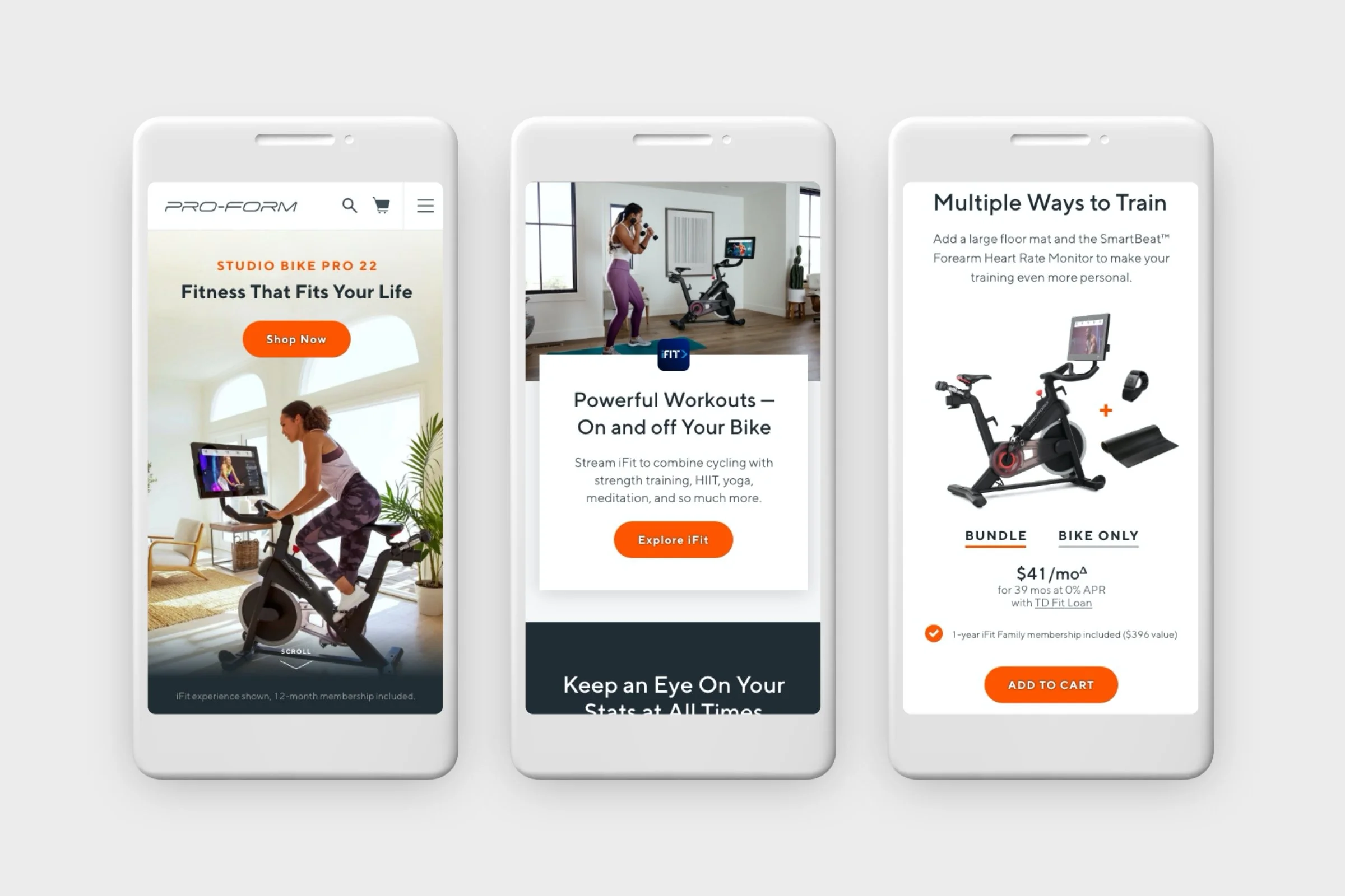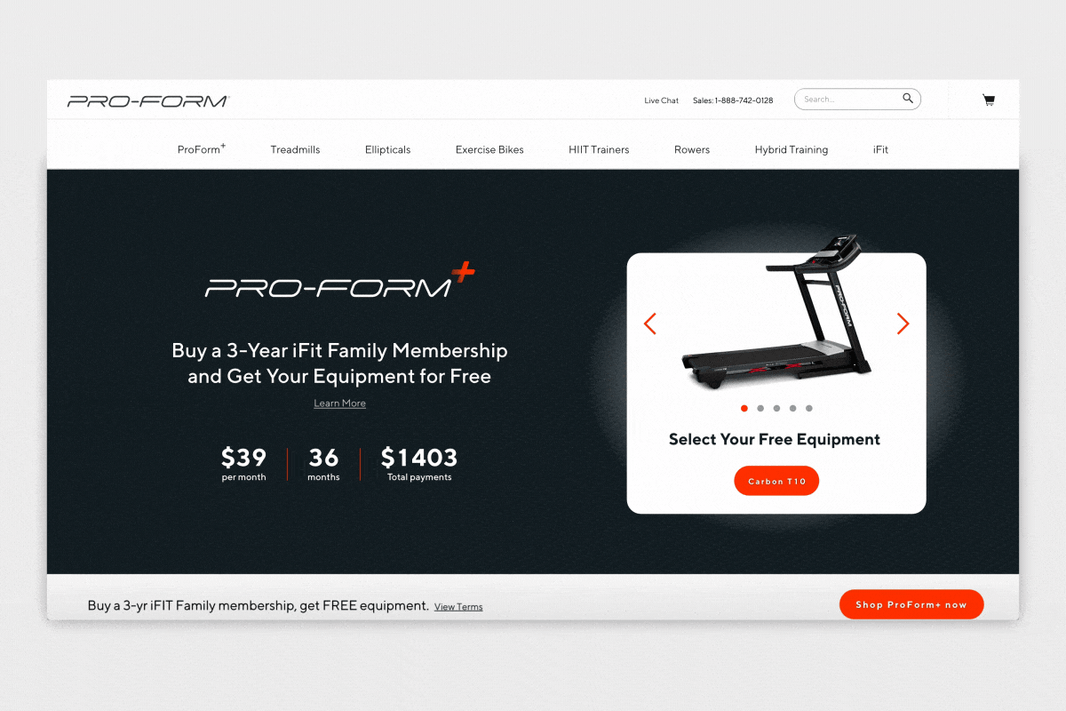 ProForm offers a special bundled service that allows users to receive a free workout machine with the purchase of a longer duration membership to its content library, iFIT. The original experience was entirely leveraged on a brand-anthem style video in the hero container that quickly explained the program with additional details following below the fold on the page. Our data showed that users who were properly informed of the details of the program resulted in higher conversion metrics which prompted us to serve a more interactive and info-rich experience in the test.
