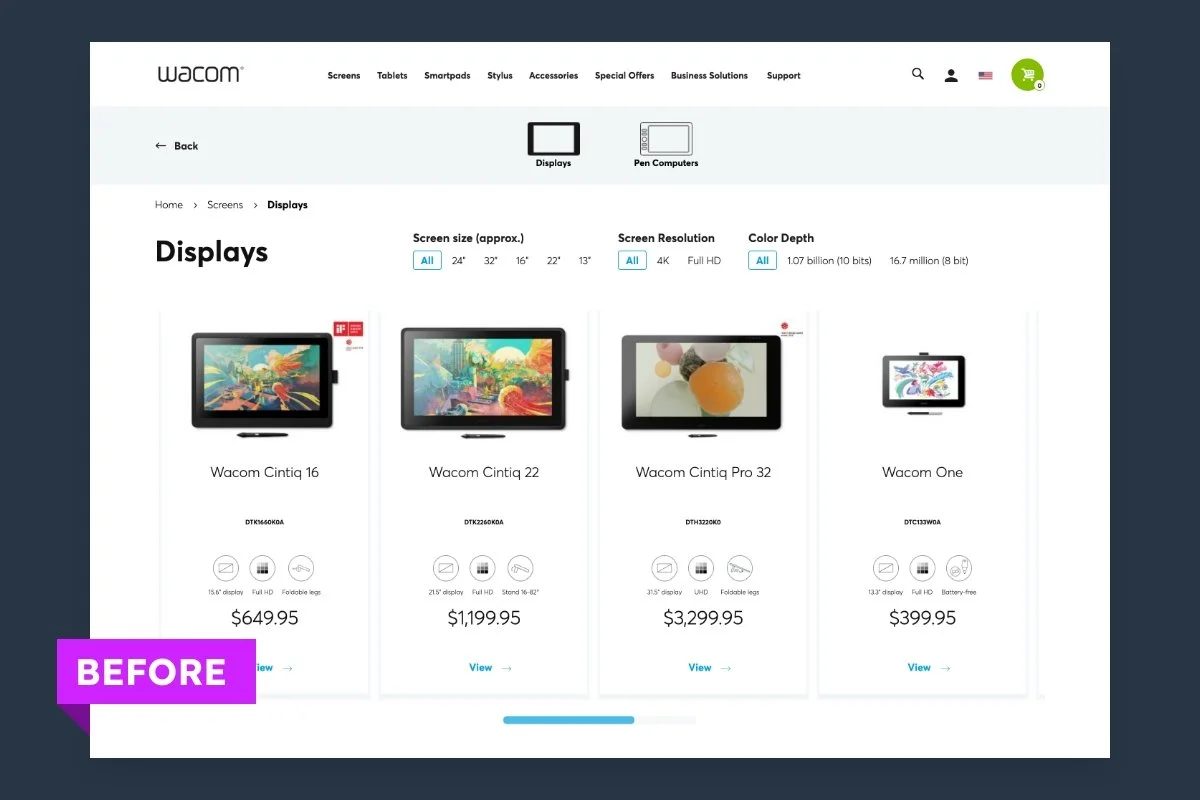 At the beginning of our engagement Wacom had just recently migrated to a new e-commerce platform which had been rolled out globally with segmented regional eStores. I’ve had to opportunity to test and iterate on the US eStore with successful tests being adopted across several if not all other regional eStores. One of the first tests revolved around restructuring the Category Page product display.